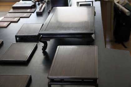 伝統工芸士をゲストティーチャーにお迎えして、東南アジアの黒檀(こくたん)や紫檀(したん)、花梨(かりん)などいわゆる唐木(からき)という木材を使った工芸品について学習しました。唐木はとても硬いので、釘が使えず、組み合わせて机や花台などを製作するそうです。磨くととても美しくなります。