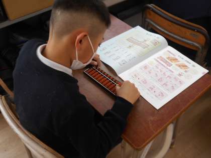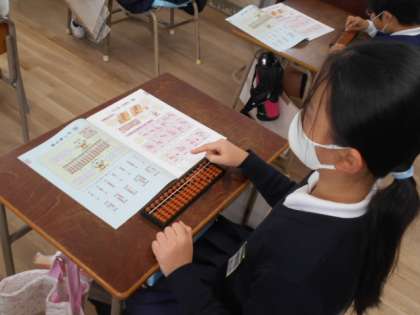 たしざんをはじめはゆっくり読み上げながら子どもたちは、そろばんを使ってけいさんしました。
