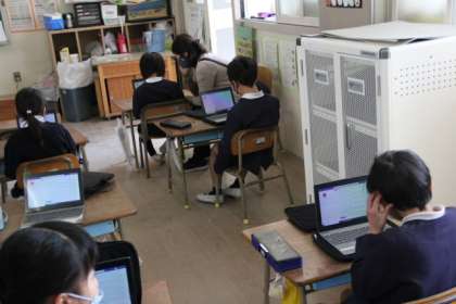 タブレットPCを使って、Teams(チームズ)の練習をしています。