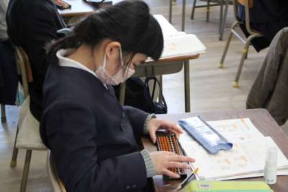 そろばんの学習です。4+4とか、7−3とか、そろばんの上の五の玉と下の4この玉の動かし方で、計算を速くすることができます。