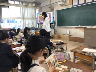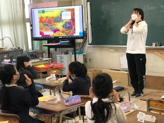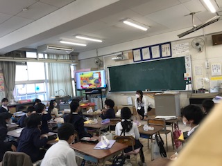 感染防止を意識して、着席しながら体を動かして楽しく英語ゲームです。明るい笑顔一杯でした。ゲームの後は、教科書で学習です。いろいろな方法で学びます。