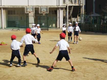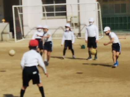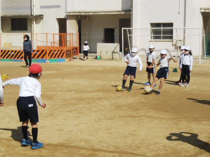 2年生のボールけりゲームです。3人が守るゴールをシュートで通すことができるでしょうか?というゲームです。