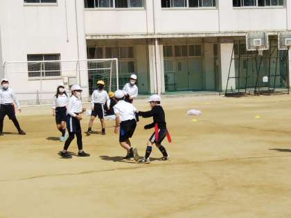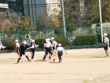 腰につけたタグをとられたら、ボールを持っている子は、ストップしなければいけないそうです。