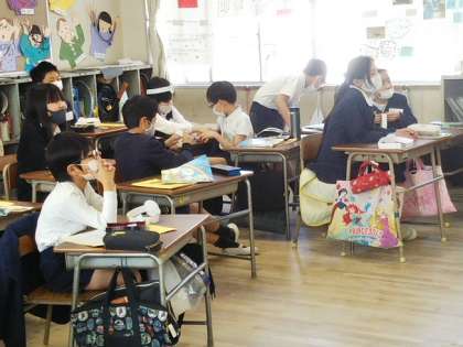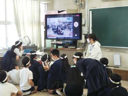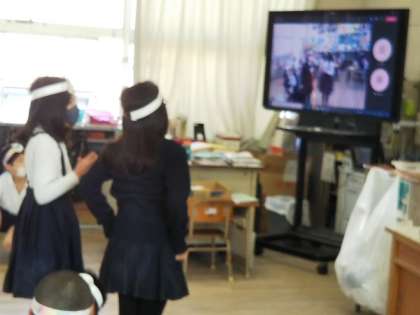 3年生の英語活動です。隣の教室ですが、3−1と3−2がTeams(チームズ)を使って、英語で交流しました。