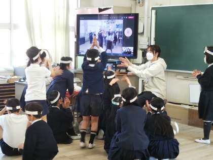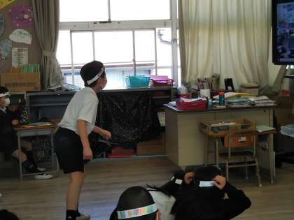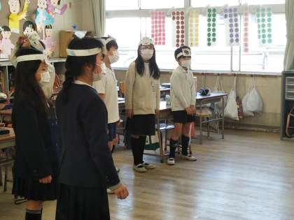子どもたちが、それぞれ動物になって、「あなたは、だれですか?」「わたしは、うさぎです」「ねずみです」「うしです」などと英語で表現していきます。