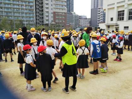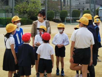 玉入れの赤玉を円になって回しながら、音楽が止まった時に赤玉を持っていたら、「おすすめの給食メニュー」とか「1年生でどんな勉強をするか」など短いコメントを発表します。