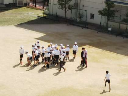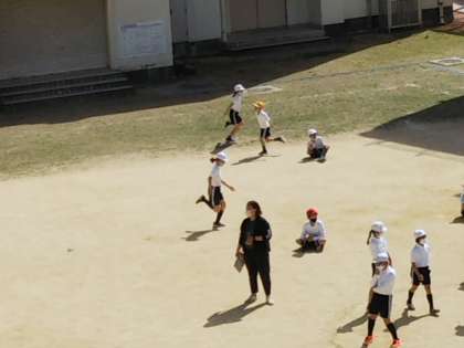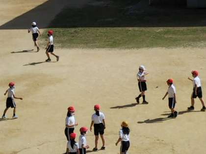 運動場をダイナミックに使って、じんとりおにごっこをしています。