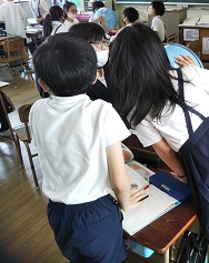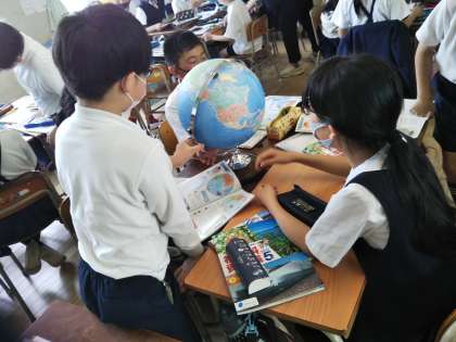 地球儀を使って、どのあたりにどんな国があるのかを確かめていました。