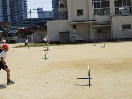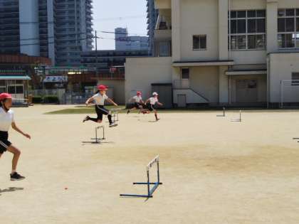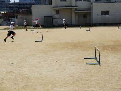 自分に合ったハードルの間隔(インターバル)を見つけて、リズミカルに走ることを目標にしています。4年生で学習したことをもとにさらに練習しています。