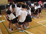今回は、「広げた新聞紙の上にどうしたら班のみんなが乗れるか」です。高学年の子は低学年の子を抱っこしてもOKです。各班で作戦を立てて〜さあ挑戦です!