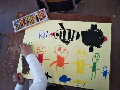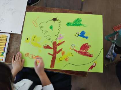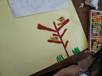 レッサーパンダとたくさんの鳥のケージが印象的だった子たちの絵です。
