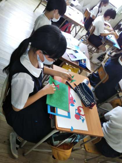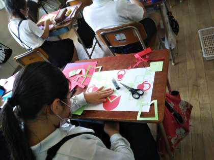 5−1の図工です。「切って・重ねて・組み合わせて」という題で取り組んでいます。