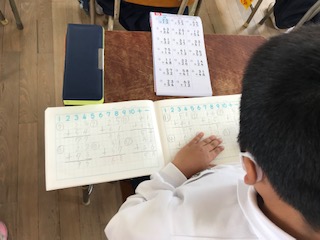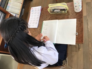 問題をていねいに書き写し、正確に計算する力を伸ばしています。位の多い計算にも慣れてきました。黒板の課題を見ながら、自分のペースで学習を静かに進める成長が見られます。