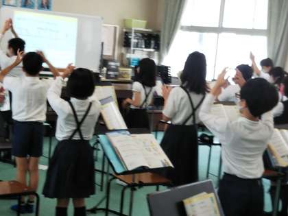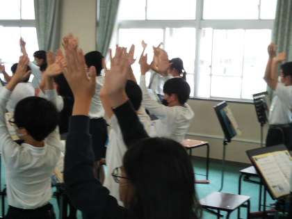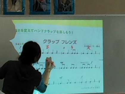 手拍子をする、足を踏み鳴らす、頭の上で手拍子をするなどをみんなでそろえて楽しみます。速さや大きさ強さを変えるとさらに楽しくなります。