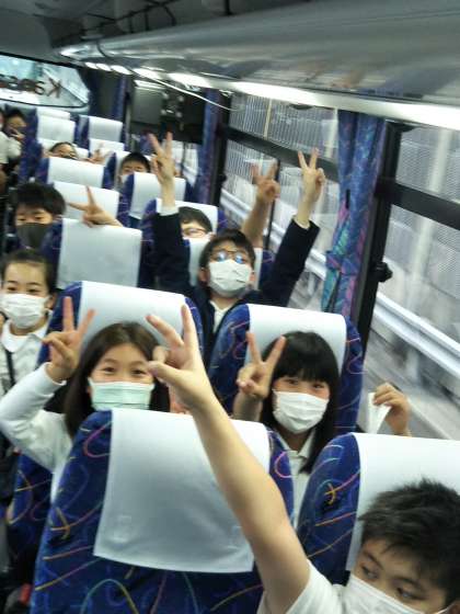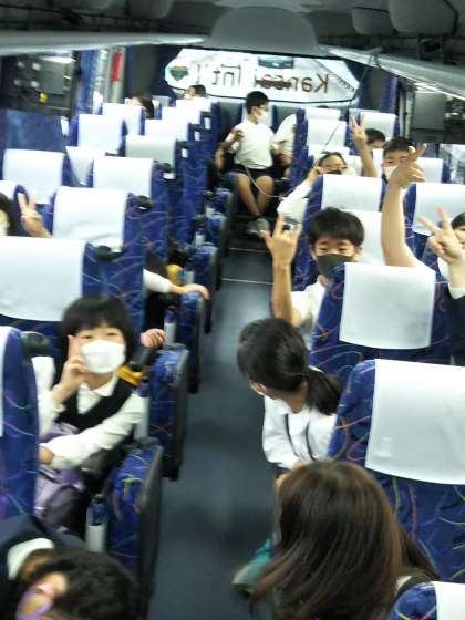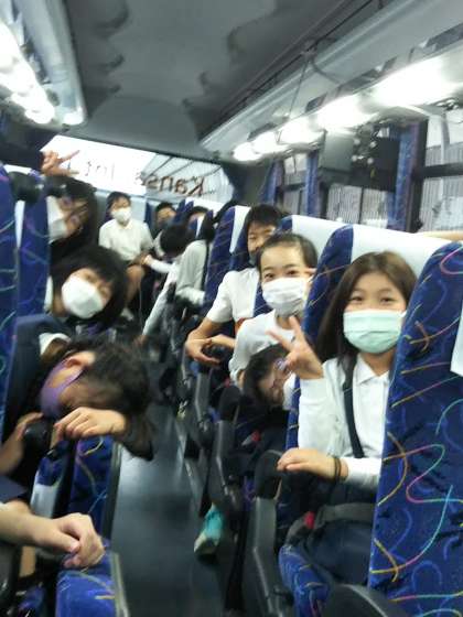 2号車です。バスレクのなぞなぞが、おわりました。眠い人は、寝ています。全員元気です。