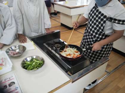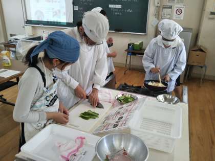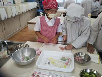 材料は、「にんじん、ピーマン、たまねぎ、ハム」です。