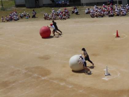 本当に良いお天気のなか、大玉転がしをしました。接戦が多く大変盛り上がりました。