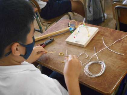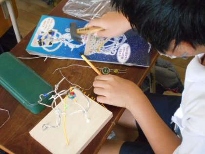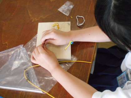 「ワイヤードリーム」というタイトルで、針金やビー玉、カラービーズを使って作品を作ります。
