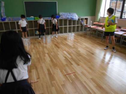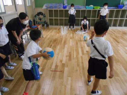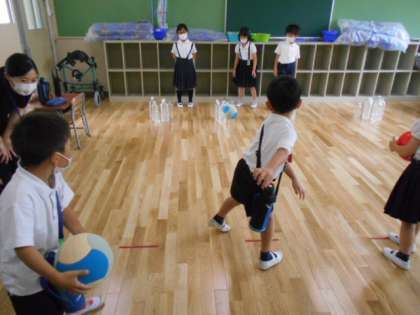 ボーリングです。ピンはペットボトル、ボールはドッジボールです。