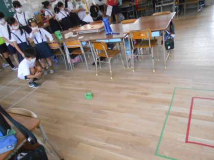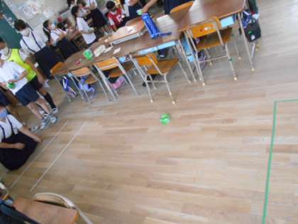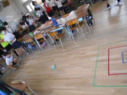 ガムテープを滑らせて、四角の的にうまく入れるゲームです。