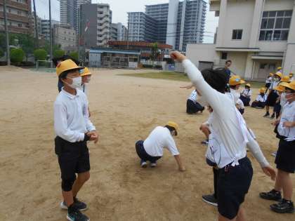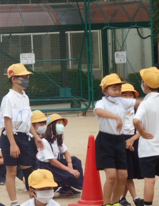 スマイル班による児童集会でした。集会委員会児童が、司会をして今日は「ジェスチャー伝言ゲーム」をしました。1回目のお題は「バスケットボール」2回目は「時計」でした。