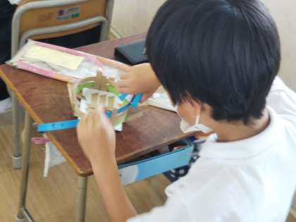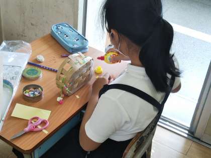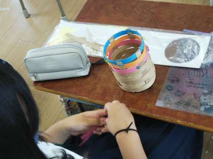 「つないで、あんで すてきな形」というタイトルで、カラフルな厚紙のテープを組み合わせて作ります。テープの長さは全部で6mあるそうです。