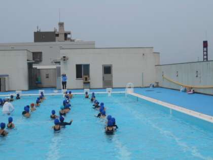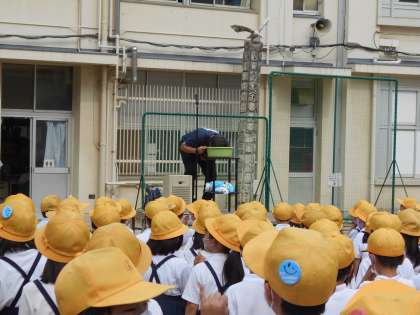 児童朝会で校長先生からお話があったあと、2時間目に1年生が小学校のプールに初めて入りました。