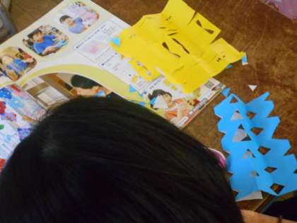 色紙をおりたたんでから、はさみで切り込みを入れたりしてもようを作ります。