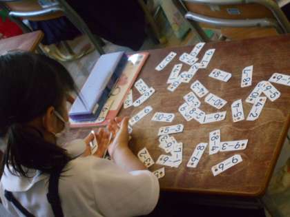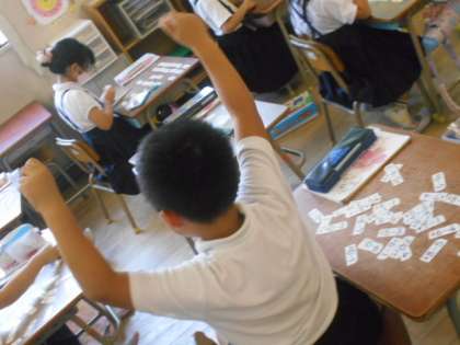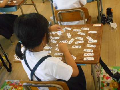 今度は、答えが「3」になるカードを探す、答えが「5になるカードを探すという問題が先生から出ました。子どもたちは、一生懸命に探して見つけていました。