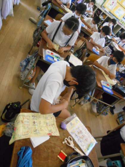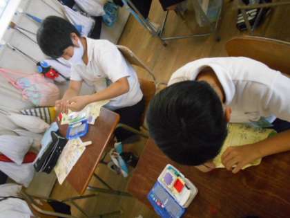 途中で針から糸が抜ける。糸がからまる。玉止めをしようと思っても、糸の長さが足りなくなる。布の間で玉止めをしようと思ってもやり方に迷う・・など、子どもたちはたくさんの苦難にも負けず、がんばって取り組んでいました。