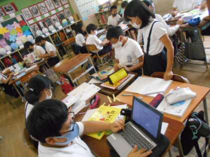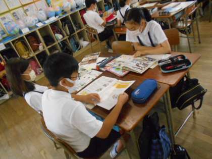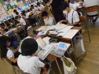 「防災ポスターをつくろう」というテーマで、海老江東小学校の児童に伝えるための、防災ポスターを「災害が起きる前」と「災害が起きてから」という整理の仕方で考え、調べていました。