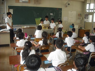 6月24日(水)図書委員会の児童が、朝の読書タイムに1年から3年、なかよしの各学級に行って、紙芝居の読み聞かせをしています。年間7回程度の予定ですが、委員会の児童も読む練習をして、低学年の子ども達の前で、上手に読んでくれています。聞く方も静かに聞き入っています。「お話がよくわかった。」「来てくれてうれしい。」などの声も聞かれました。異学年児童の交流も図れて、心が温まる活動です。