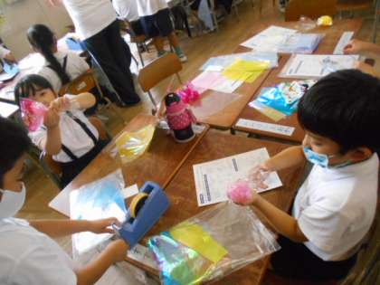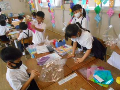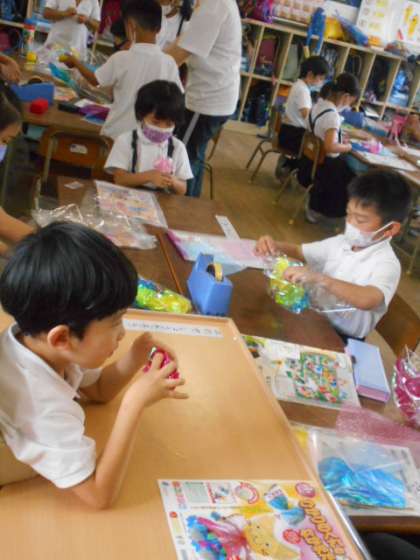 名前を書いたあと、それぞれがふくろにカラーセロハンやエアクッションを入れたり、モールを使ったりして、動物やさかないろいろなものに見たてて、作るイメージを広げていました。