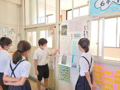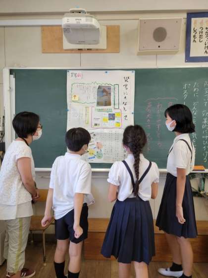 がんばって準備、練習してきた防災に関するポスターセション本番、発表です。3つの教室に分かれて、それぞれのグループが発表。仲間の考えを聞き合い、自分の思いや考えも高める交流ができました。