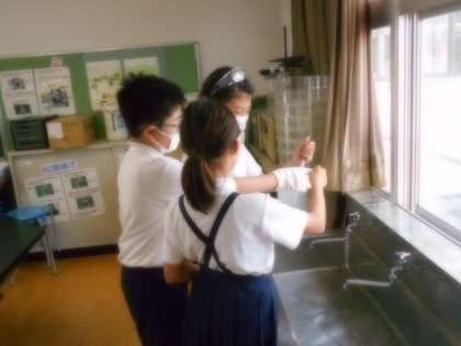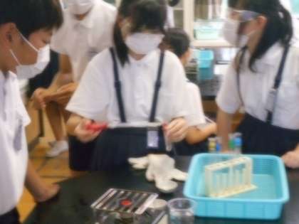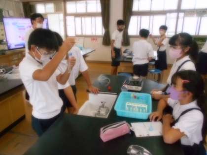 「水溶液の性質」という学習で、食塩水、炭酸水、うすい塩酸、アンモニア水、重曹水を調べました。見た目、においなどをまず確かめました。