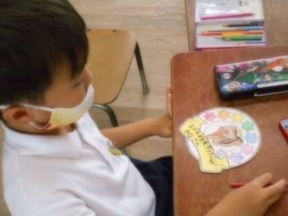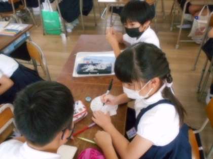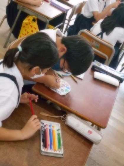 3−2の学級活動です。10月に予定されている「見守り隊お礼の会」に向けて、お礼のメダルを手作りしています。