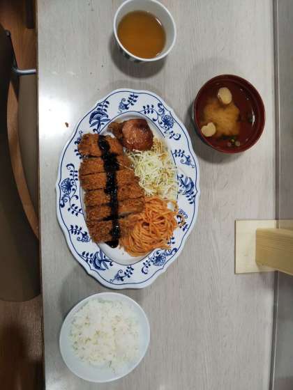 夕食です。トンカツです。以前なら、かもなべやすき焼きだったのですが、このご時世です。