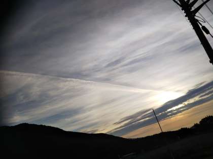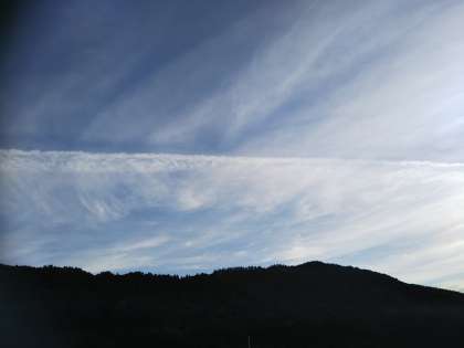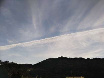 北から東にかけて、とても太い飛行機雲?が、ダイナミックに見えていました。