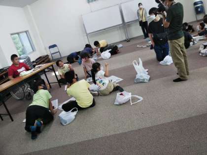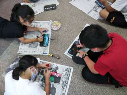 魚つかみ、キャンプファイヤー、山登りなど、子どもたちは、それぞれのイメージ、色、形で表現していました。
