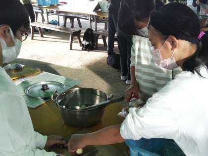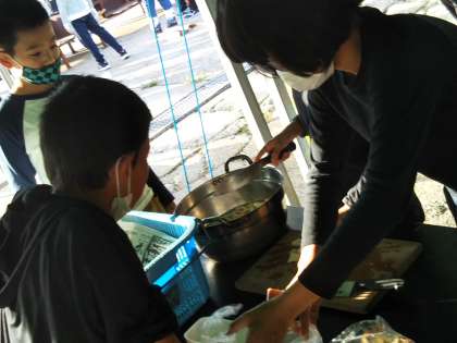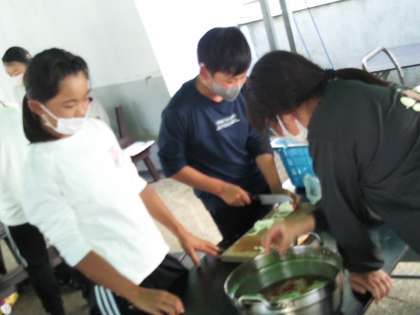 調理グループです。包丁やピーラーを使うので、慎重さやチームワークが必要です。