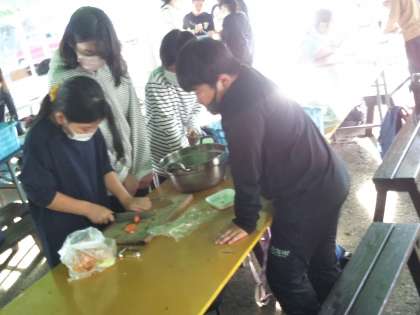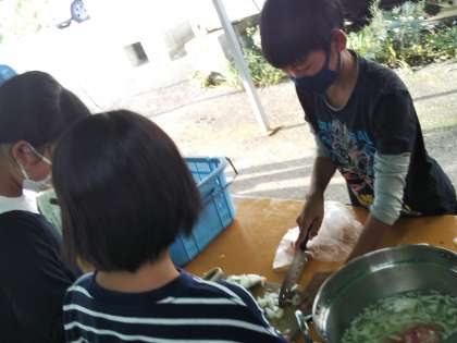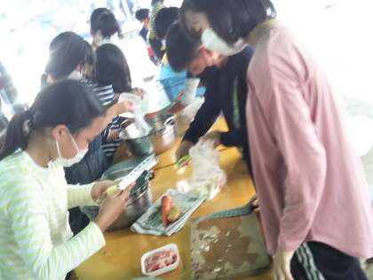 調理グループのパート2です。特にニンジンは、煮えにくいので、大きさや厚さを考えなければいけません。