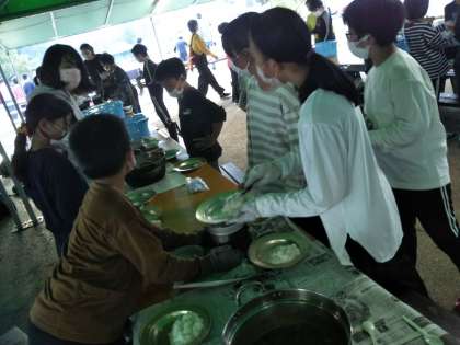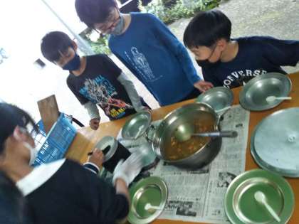 できましたよ!つぎつぎとご飯とカレーができてきました。盛り付けが終わったグループから食べ始めました。いくつか試食させてもらいました。にこやかに「どうぞどうぞ!」とすすめてくれました。じゃがいも、ニンジンが柔らかくてとても美味しかったです。