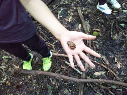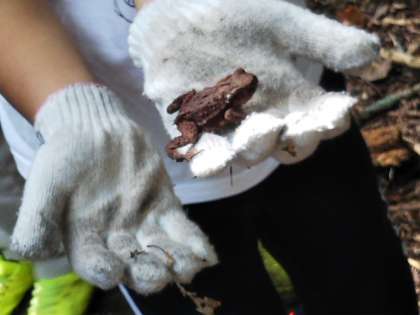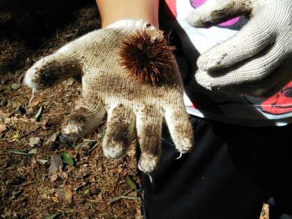 トノサマガエル、ヒキガエルがいました。ヒキガエルは、毒を持っている可能性もあるので、軍手をはめています。栗もたくさん落ちていました。