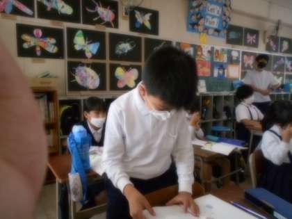 「菜の花や 月は東に 日は西に」や「名月を とってくれろ と泣く子かな」などが例示された教科書から、お気に入りの俳句を選んで、選んだ理由とイメージ画をかくという学習をしました。