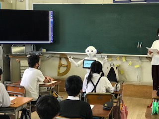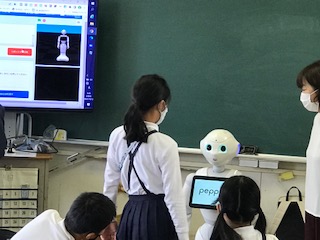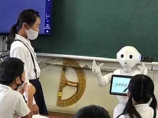 学習の初めに、まずPepperと楽しくふれあいを深めました。あいさつをしたり、名前を伝えたり、まるで新しい仲間を迎えたようです。拍手や歓声がおこり、あたたかく接する子どもたちの様子が見られました。