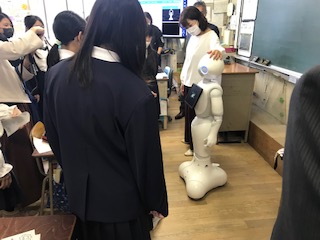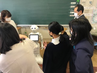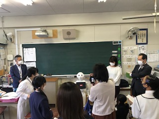 次のクラスで、再度、学習がはじまります。Pepperが部屋にやってくると、みんな興味深々、Pepper が目覚めると歓声が起こりました。区役所の方々ともPepper を囲んで和やかなひと時を過ごせしたことも子どもたちにとって貴重な経験となりました。