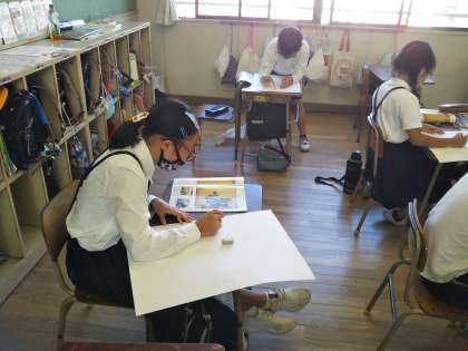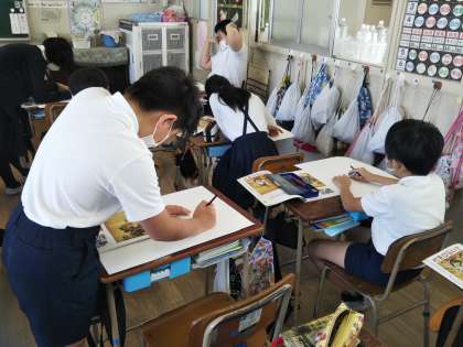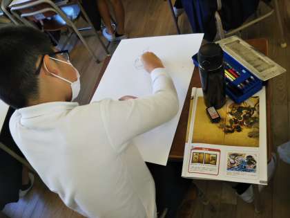 「風神雷神の図」など古今東西の名作を自分で模写する学習活動です。