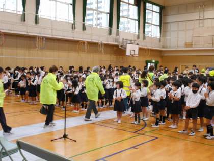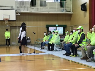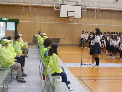 代表児童から感謝のご挨拶をのべました。この後、それぞれの学級から、子どもたちが感謝を込めて作ったカードをお渡ししました。これからも、どうか子どもたちをあたたかく見守ってくださいますようお願い申しあげます。