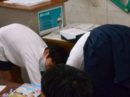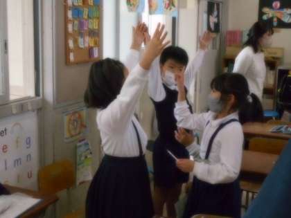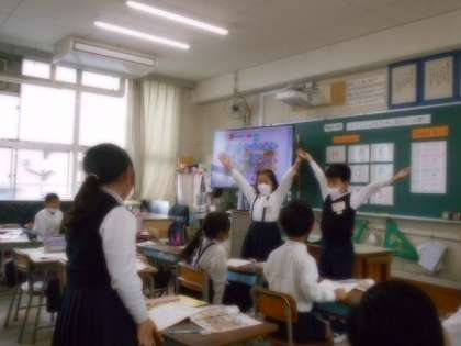 ペアやグループで活動して、二人でアルファベットの大文字を表現して当てる活動をしていました。
