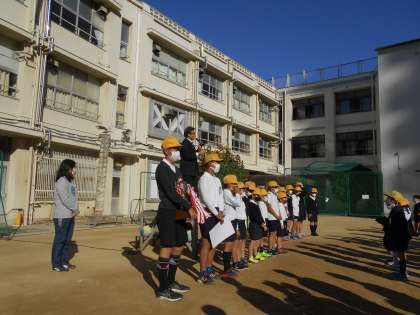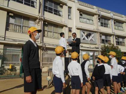 児童朝会で児童の表彰がありました。10月16日(日)に開催された、ライオンズ杯の